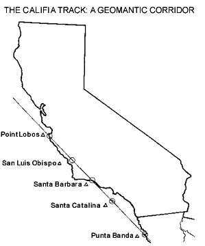 Among others, there are very good psychosomatic reasons for the straight track in the landscape, which bind Magic to Geomancy. External mental travel is much easier to achieve with continuous clarity if the body is imagined to float frontally in a single direction. At twelve o'clock noon daily, I make a psychic traverse of the Shandaiya Track (Punta Banda, Baja Califia-Isthmus, Santa Catalina-Painted Cave, Santa Barbara-Reservoir Canyon, San Luis Obispo-Bird Rock, Point Lobos: much too long to be a Ley in the classical Watkins sense.) During this practice, it has become abundantly clear to me that moving from one carefully memorized landmark to another works much better for the Inner Eye in a straight line through the vistas. We can visualize or evoke one landscape image after another with increasing proficiency if they can be imagined to follow one another without necessitating rotation of the visionary body.